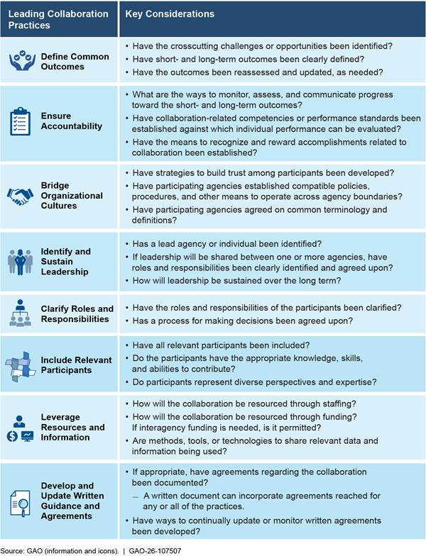 [15]See GAO, Government Performance Management: Leading Practices to Enhance Interagency Collaboration and Address Crosscutting Challenges, GAO‑23‑105520 (Washington, D.C.: May 24, 2023).