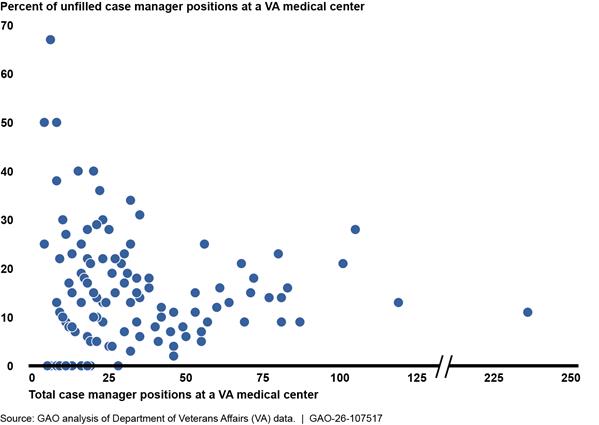 VA has faced challenges hiring and retaining enough case managers. In fiscal year 2024, more than one-quarter of medical centers with two or more case managers had at least 20 percent of these positions unfilled (see figure). Factors contributing to vacancies included staff burnout and turnover. GAO analysis of VA data shows that annual case manager turnover ranged from 20 percent to 26 percent in fiscal years 2020–2024. Stakeholders at all eight sites GAO visited described periods of high turnover and persistent vacancies. The effects of insufficient staffing include reduced services for veterans and delays in admitting new participants.