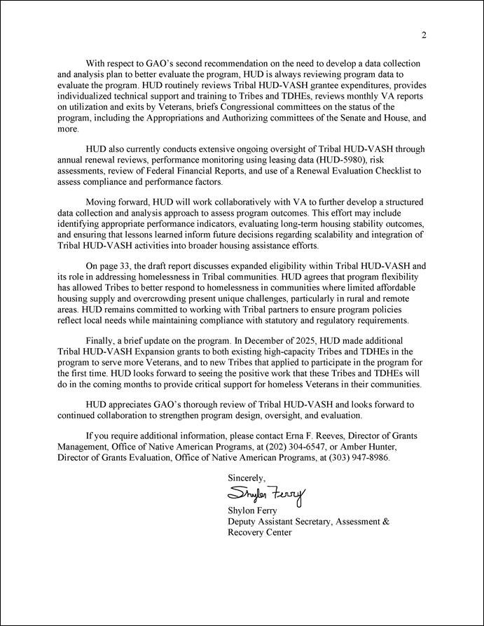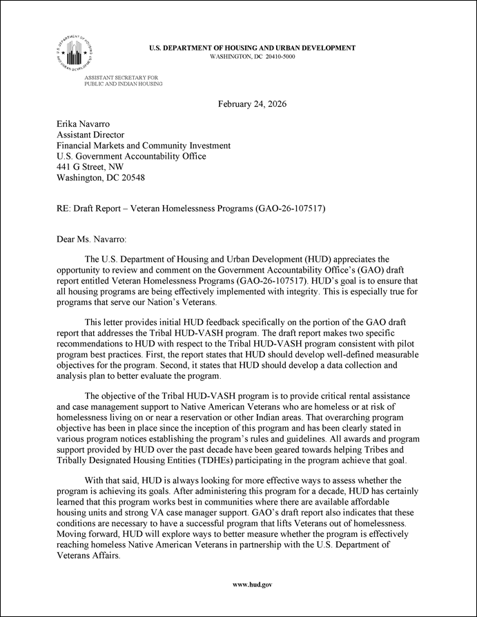 [79]Department of Housing and Urban Development, Office of Public and Indian Housing, Report to Congress on the Tribal Housing and Urban Development-Veterans Affairs Supportive Housing Program (Washington, D.C.: March 2020).