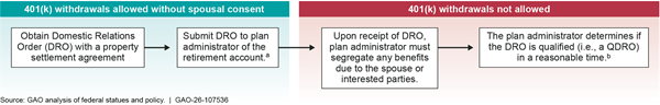 Choosing to Remove Funds from Defined Contribution Accounts Federal law prescribes the circumstances in which retirement plans can allow participants (i.e., the eligible employees covered by the retirement plan) to remove funds through withdrawals, loans, and distributions from their plan accounts. Federal law also prescribes the applicability of spousal consent requirements to remove funds. This report focuses on active removal of funds (e.g., not on removal of funds through the plan’s default distribution option). Plans are not required to offer all distribution options to participants. For example, defined contribution plans are permitted but not required to provide distributions in the case of hardship. A plan may elect to include spousal consent requirements in its design, even if it is not required to. Spousal consent requirements impose a restriction on a plan participant’s ability to remove funds. Source: GAO analysis of federal law and agency guidance. | GAO‑26‑107536 |