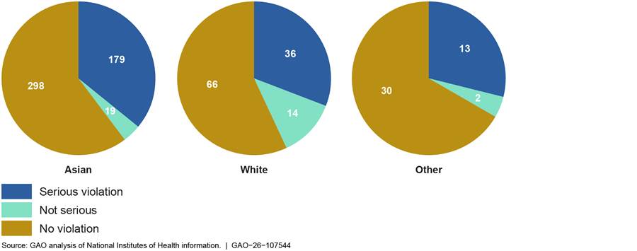 As of September 2025, National Institutes of Health (NIH) was the only one of the five selected agencies that was collecting data that could be used to assess potential discrimination. Therefore, we analyzed NIH’s data to determine whether collecting and analyzing demographic data could help provide information about the potential existence of discrimination in improper foreign influence reviews. NIH provided us with improper foreign influence data from 2017 to 2024. The data contained 657 allegations of improper foreign influence.[46] For this analysis, we focused on the following data points: