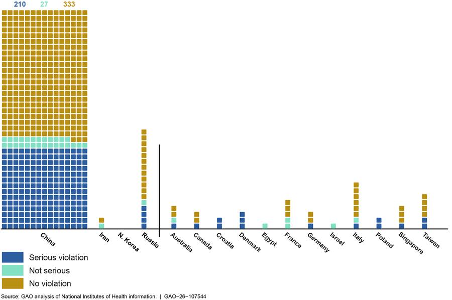 [25]Statistical significance was assessed using a Chi-square test of proportions (p <.05). NIH defined serious violations as undisclosed foreign grant support, undisclosed foreign talents award (i.e., compensation received in a malign foreign talent recruitment program), undisclosed financial relationship with a foreign company, undisclosed foreign patent, or undisclosed significant financial interest.