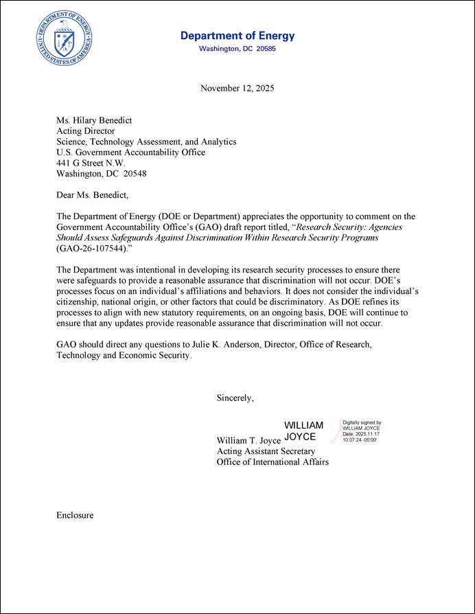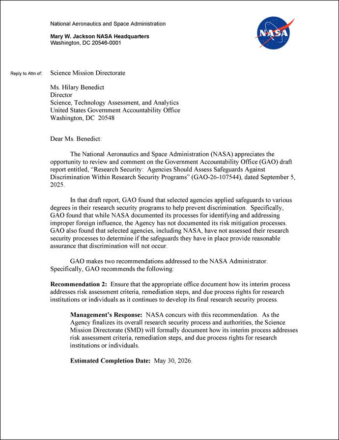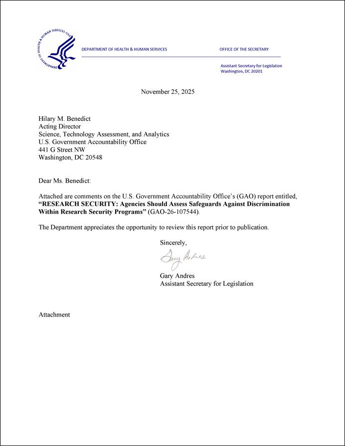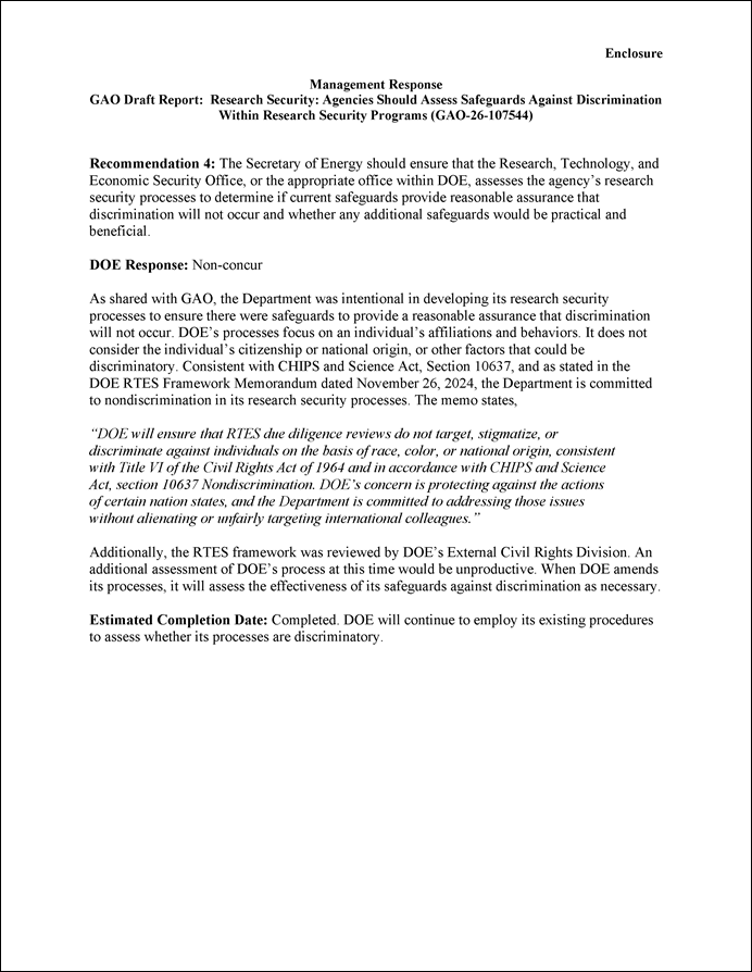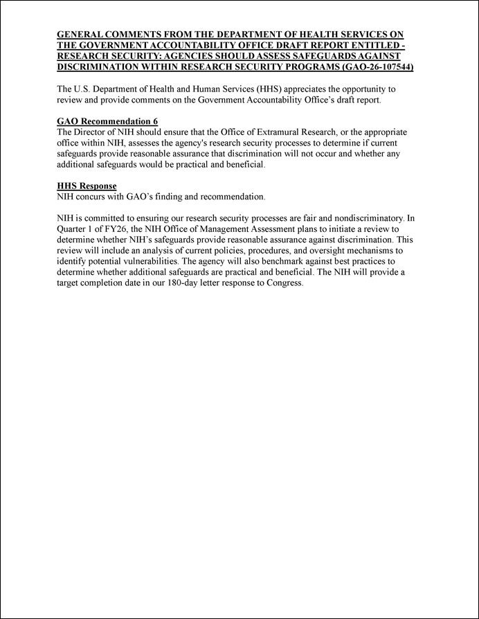 You asked us to examine whether federal agencies ensure that research security reviews are free from discrimination. In this report, we assessed the extent to which selected agencies have implemented safeguards to prevent discrimination in research security processes.