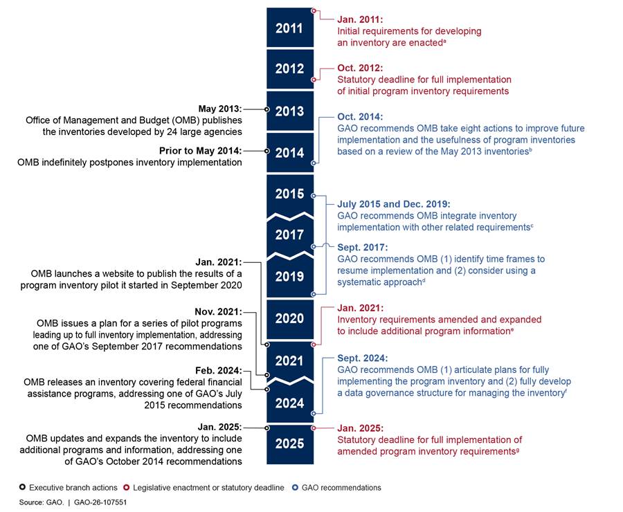 Since 2011, Congress and the Executive Branch have taken various actions to require and develop an inventory of federal programs. For example, in 2013, OMB published individual inventories developed by 24 large agencies in response to initial statutory requirements established in January 2011.[14] In 2021, Congress amended and expanded those requirements and OMB subsequently launched the federal program inventory website in February 2024.[15]