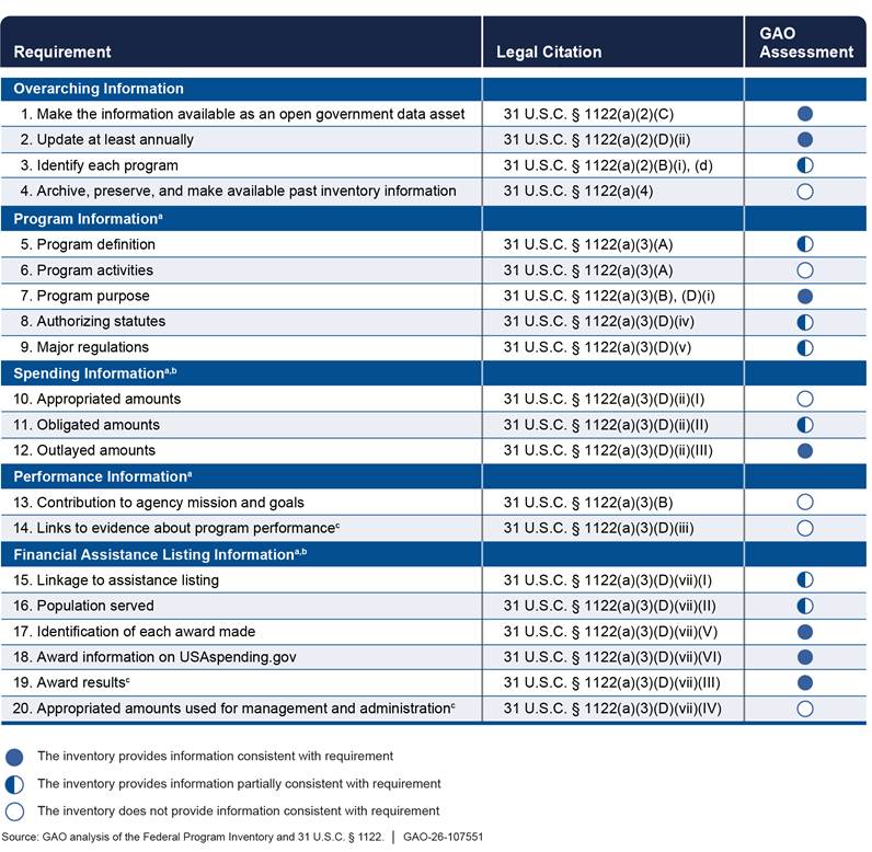 However, OMB has not yet addressed all statutory requirements for the inventory. As shown in figure 3, we organized the 20 statutory requirements into five categories: overarching information, program information, spending information, performance information, and financial assistance listing information. We found that the information provided in the January 2025 inventory is