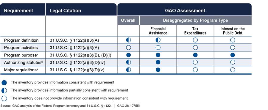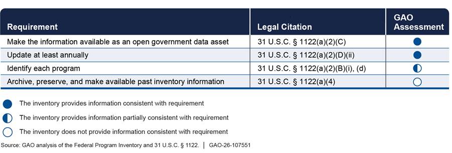To address our first objective, we assessed the extent to which the information in the inventory was consistent with statutory requirements for the inventory overall as well as for individual programs.[8] We examined a variety of pages on the website that provide information about (1) the inventory and the data it presents overall, and (2) the three different types of federal programs included in the January 2025 version of the inventory: financial assistance, tax expenditures, and interest on the public debt. We randomly selected a program within each of the three types to assess.[9] To assess those overall and program-specific webpages, an analyst compared the information presented on those pages to relevant statutory requirements to determine the extent to which they were consistent. Another analyst then independently confirmed the assessment. We did not assess the extent to which the information presented on all inventory pages was accurate, complete, or available for all programs.