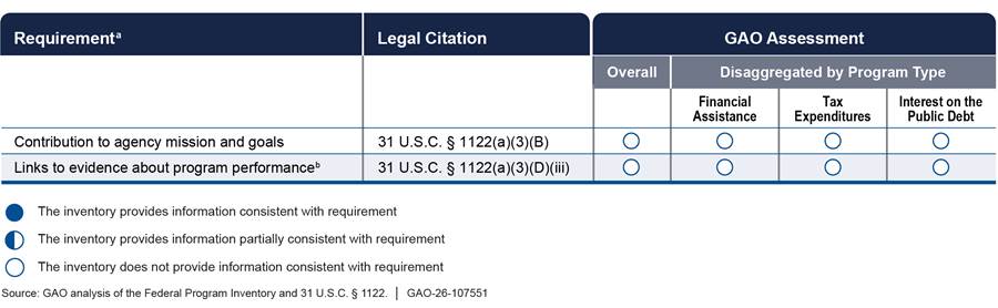 aThe inventory is to present information for the requirements in this category at the program activity level (and, for the program purpose and contribution to agency mission and goals requirements, also at the program level). Program activity refers to a specific activity or project listed in the program and financing schedules of the President’s budget. Program activity structures are intended to provide a meaningful representation of the operations financed by a specific budget account. The January 2025 inventory does not include program activity information. Therefore, we assessed the consistency of these requirements with the program-level information it provides.