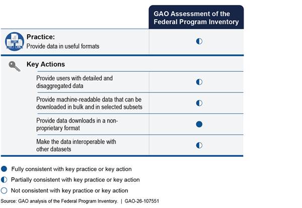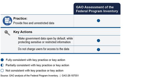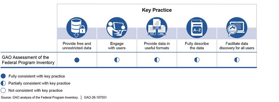 [10]GAO, Open Data: Treasury Could Better Align USAspending.gov with Key Practices and Search Requirements, GAO‑19‑72 (Washington, D.C.: Dec. 13, 2018). In that report, we identified five key practices and 18 key actions by systematically evaluating and synthesizing information from literature on open data, as well as interviews with open data experts and good governance groups. Since the inventory is to be an open government data asset—that is, government-produced information that can be freely used, modified, and shared by anyone for any purpose—these key practices and actions are relevant to its implementation.