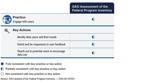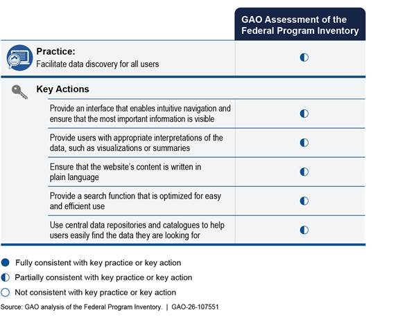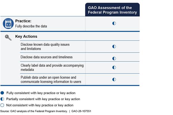For example, the practice to fully describe the data involves an action to disclose known data quality issues and limitations. GAO found that OMB had disclosed some inventory data quality issues, such as potential discrepancies between two different sources of program spending data. GAO’s assessment identified additional quality issues, such as inactive programs being included in the inventory and missing spending data.
