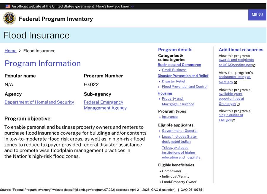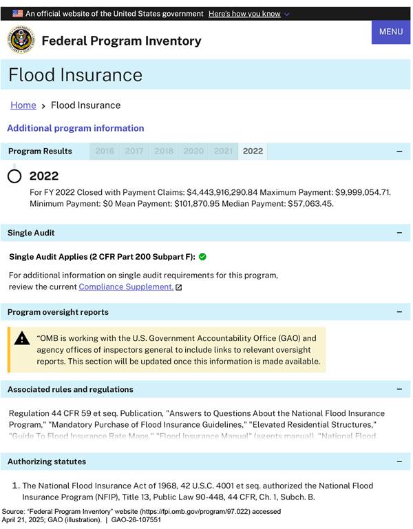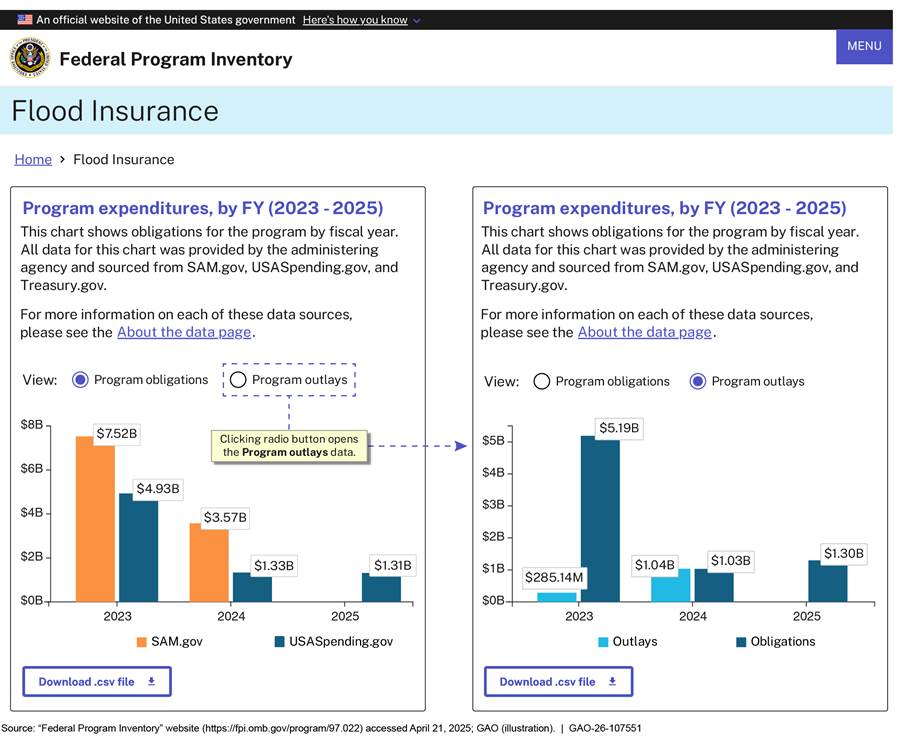 [113]For figures 22, 23, and 24, we used Flood Insurance as the sample financial assistance program because we presented information from this program’s page in the February 2024 version of the inventory in our September 2024 report. See appendix I in GAO‑24‑107656.