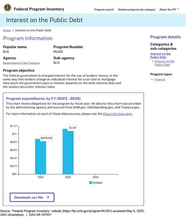 [50]In several places, the inventory states that it presents obligations data for interest on the public debt. See, for example, https://fpi.omb.gov/about/about‑the‑data. However, on the webpage for that program, those data are labeled as outlays. See https://fpi.omb.gov/program/IN.001. Therefore, we considered them outlays for the purposes of our report.
