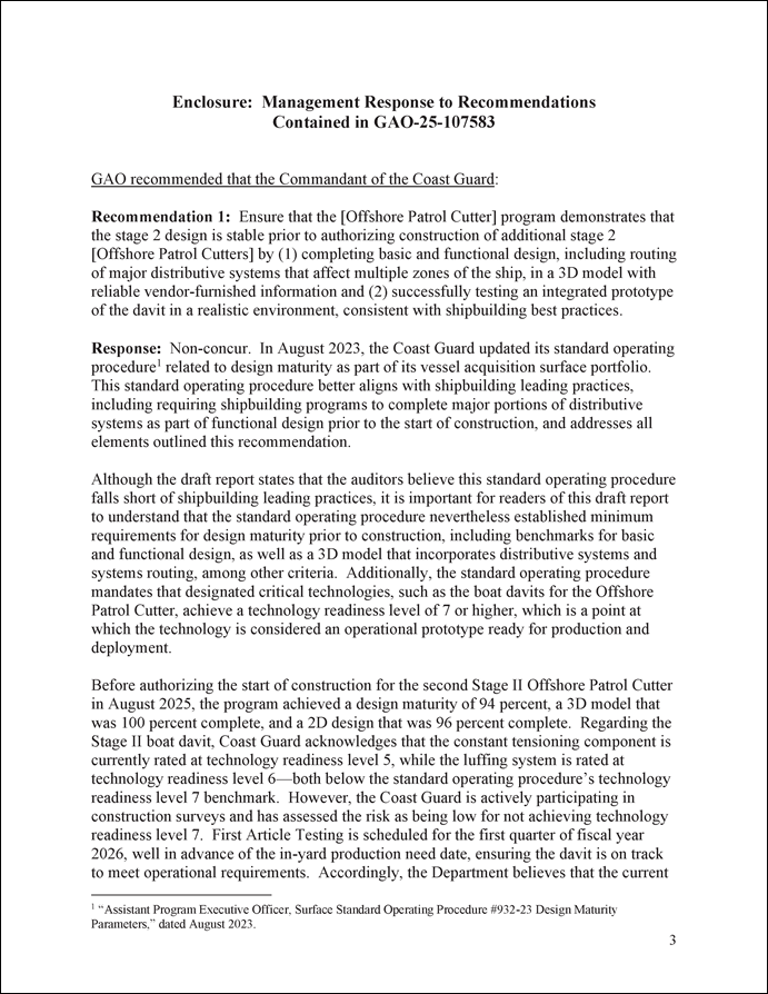 [2]GAO, Coast Guard Acquisitions: Offshore Patrol Cutter Program Needs to Mature Technology and Design, GAO‑23‑105805 (Washington, D.C.: June 20, 2023).