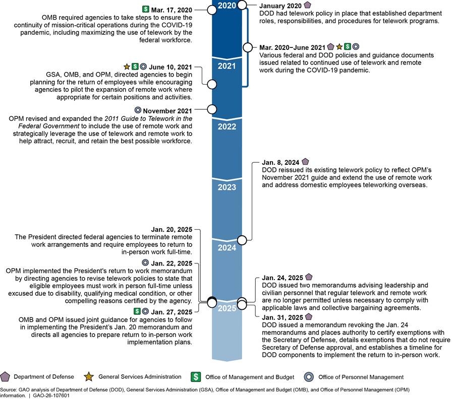 Since 2020, DOD telework and remote work policies have evolved to reflect federal guidance directing agencies to expand and, more recently, to reduce the use of telework and remote work by federal employees. The DOD telework policy that was in place in January 2020 applied to both civilians and service members and encouraged use to the broadest extent possible by eligible employees on a routine or situational basis. During the COVID-19 pandemic, use of telework and remote work continued to expand until mid-2021, when federal guidance directed agencies to begin planning for the return of employees to the office while also allowing agencies to pilot the expansion of remote work where appropriate for certain positions and activities. In January 2025, a presidential memorandum directed federal agencies to take steps to terminate remote work agreements and require most employees to return to work in person on a full-time basis. DOD has taken steps to implement this requirement, and nearly all civilian employees had returned to full-time in-person work by June 2025.