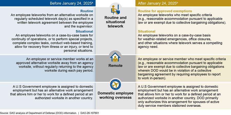 Figure 2 provides a comparison of the types of telework and remote work arrangements available to DOD employees before and after January 2025.