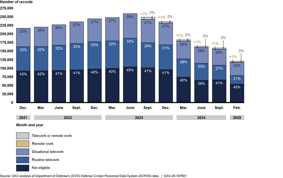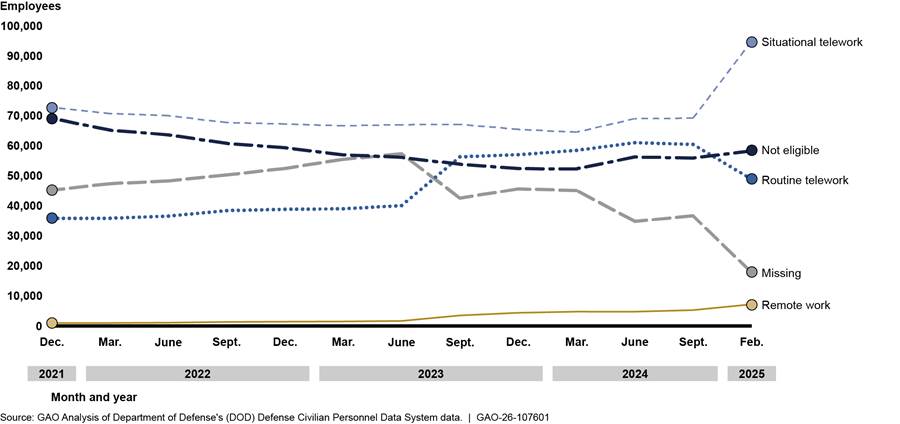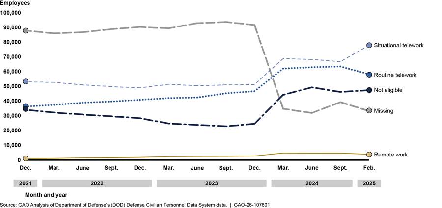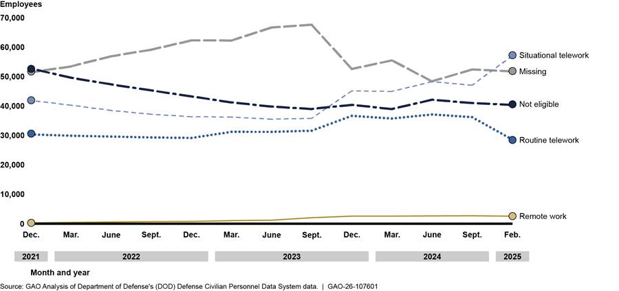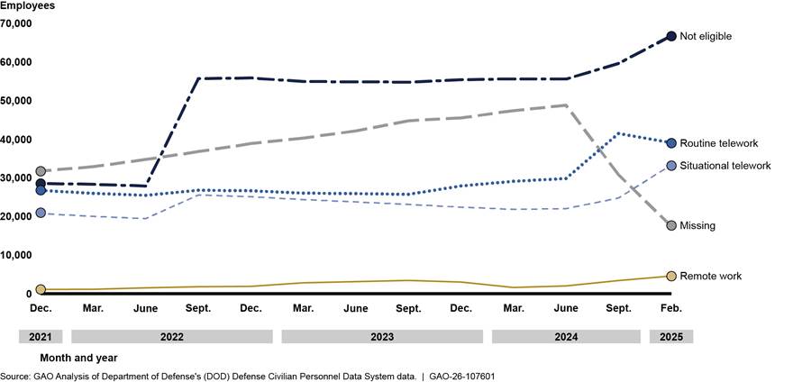GAO reviewed data for 13 selected dates from December 2021 through February 2025 and found that, although between 65 and 68 percent of DOD civilian employee positions were eligible for telework or remote work, data on actual employee eligibility were incomplete. Therefore, data on the number of teleworkers and remote workers DOD previously reported are likely inaccurate. For example, in May 2024, DOD publicly reported it had 61,549 remote employees. One month later in June 2024, DOD told GAO that it had 35,558 remote employees. The Office of Personnel Management and DOD policy require the collection of data about position and employee eligibility for telework and remote work, but DOD officials told GAO there is no formal process in place to ensure eligibility data are accurate, timely, or complete. Without formal processes for collecting data on employee eligibility, DOD lacks visibility into the use of these flexibilities and may not be able to ensure compliance with DOD policy to collect accurate and reliable data on use of these flexibilities.
