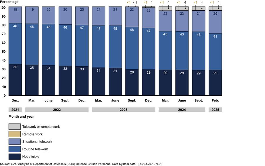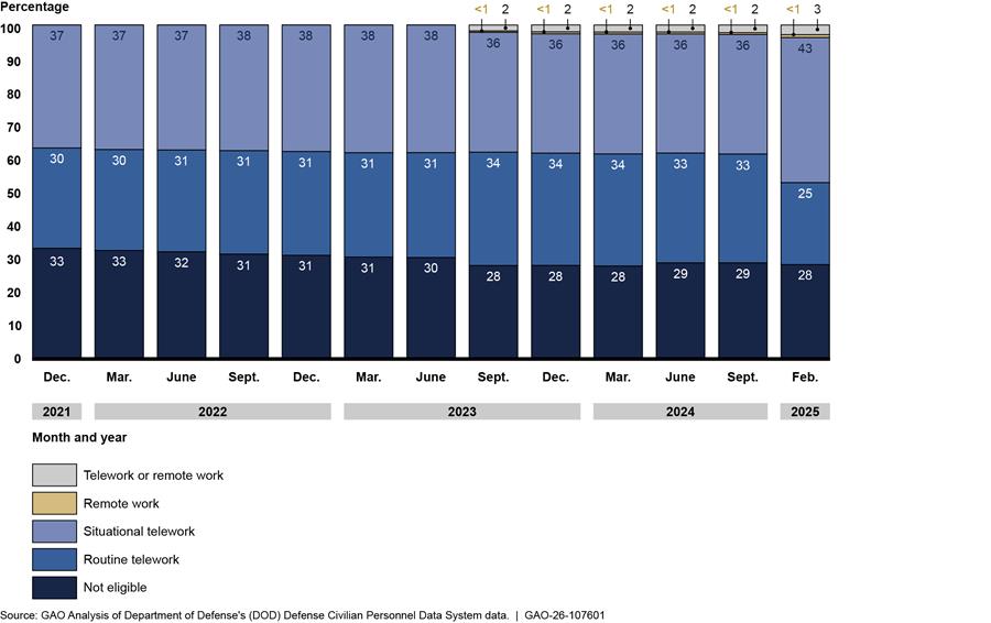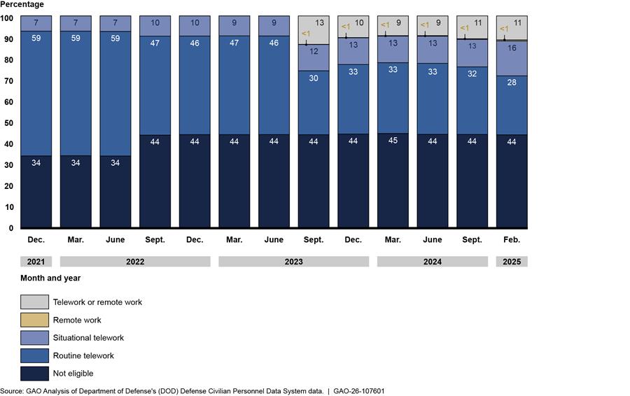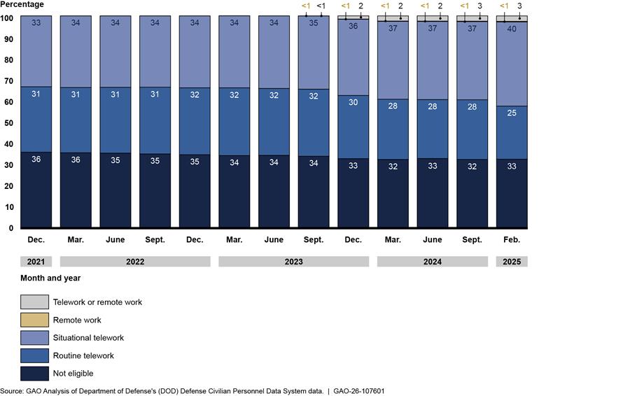 Since 2020, the Department of Defense’s (DOD) telework and remote work policies have changed to reflect federal guidance on the use of these flexibilities by federal employees. In January 2025, DOD directed the return to in-person work for all employees in compliance with a presidential memorandum requiring all executive branch employees to work in-person on a full-time basis, with limited exceptions. According to officials, as of July 2025, about 8 percent (62,000 of 780,000) of DOD employees had not returned to in-person work, with 6 percent (45,000) of those due to deferred resignation status or other exemptions and another 2 percent (17,000) due to reasonable accommodations.