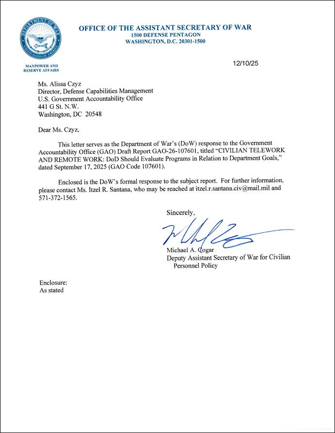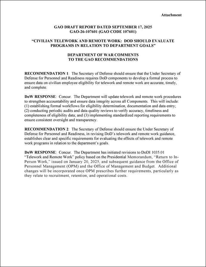 [24]Acting Secretary of Defense Memorandum, Implementation of Presidential Memorandum, “Return to In-Person Work” (Jan. 24, 2025); Acting Secretary of Defense Memorandum, Guidance on Presidential Memorandum, “Return to In-Person Work” (Jan. 24, 2025).