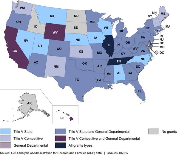 Note: In fiscal year 2025, Illinois and Tennessee received funding for all three grant types. According to ACF officials, Title V Competitive grants in these states ended in September 2025.
