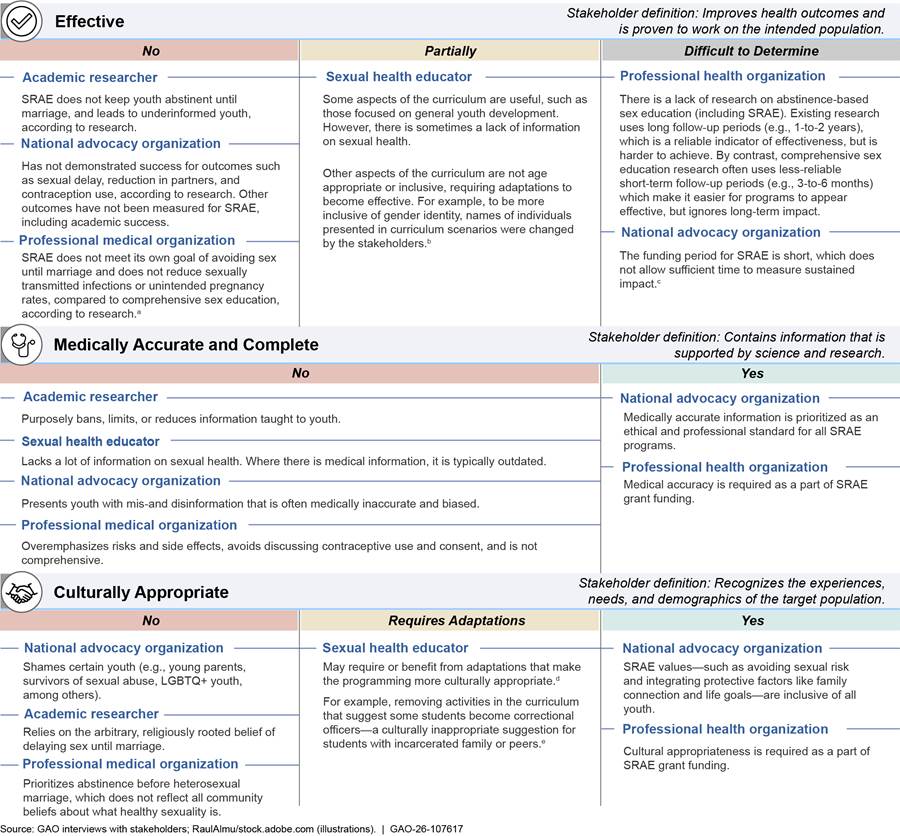 The eight selected stakeholders we interviewed had various perspectives on whether SRAE in general, including federally funded SRAE, is effective, medically accurate and complete, or culturally appropriate. See figure 2 for statements stakeholders made on SRAE.