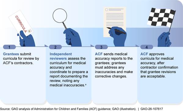 In 2011, ACF established a post-award contractor-led process to review the medical accuracy of grantees’ curricula, which includes all educational materials or information provided to participants, according to officials.[25] (See fig. 3.) As part of the process, the contractors maintain a list of approved curricula. Approved curricula retain that status for 5 years; therefore, the contractors typically review curricula only once every 5 years. However, all curricula not previously approved in the last 5 years will be reviewed by contractors. As of September 2025, there were 122 curricula on the approved list. However, ACF guidance encourages grantees to regularly review the curricula they use to update information as necessary.