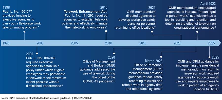 Since 1998, multiple federal laws, as well as agency guidance, have addressed telework in the federal government, as shown in figure 1.[13]