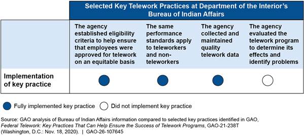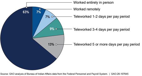 Highlights Bureau of Indian Affairs (BIA) ended routine telework in response to the President’s January 2025 memorandum after several years of decreasing use. BIA officials said that limited telework use was one of several factors that may have contributed to staffing challenges. · Agency Operations: BIA officials said telework reductions beginning in April 2024 could exacerbate recruiting problems primarily driven by other factors. · Customer Service: BIA officials said factors other than telework led to a substantial backlog in carrying out their probate responsibilities. BIA had taken steps to implement key telework practices, but had not evaluated its telework program to determine its effects and identify problems. |