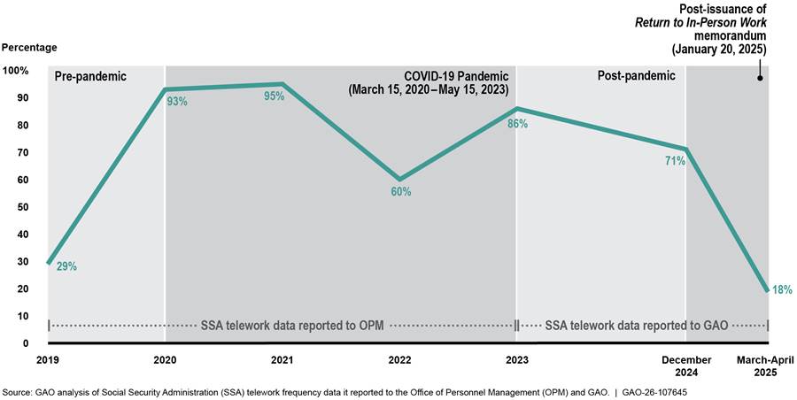 Telework use decreased following the end of the COVID-19 pandemic emergency and the President’s January 2025 Return to In-Person Work memorandum among three federal agencies GAO reviewed: the Department of the Interior’s Bureau of Indian Affairs (BIA), the Social Security Administration (SSA), and the Department of State’s Bureau of Consular Affairs (CA).