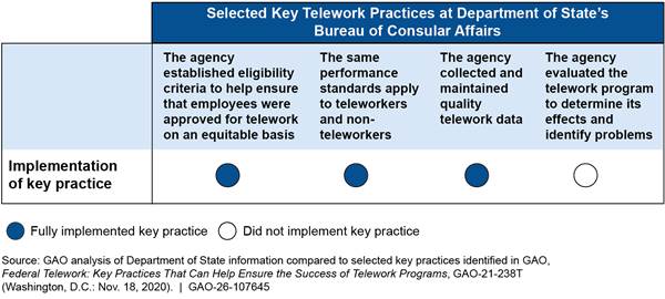 [20]GAO‑21‑238T and Office of Management and Budget, Memorandum M-23-15 (Apr. 13, 2023). Note that some of these key practices incorporate legal requirements under the Telework Enhancement Act, Pub. L. No. 111-292, 124 Stat. 3165 (2010), including prohibiting employees from teleworking due to poor performance or certain disciplinary actions and treating teleworkers and non-teleworkers the same for performance purposes.