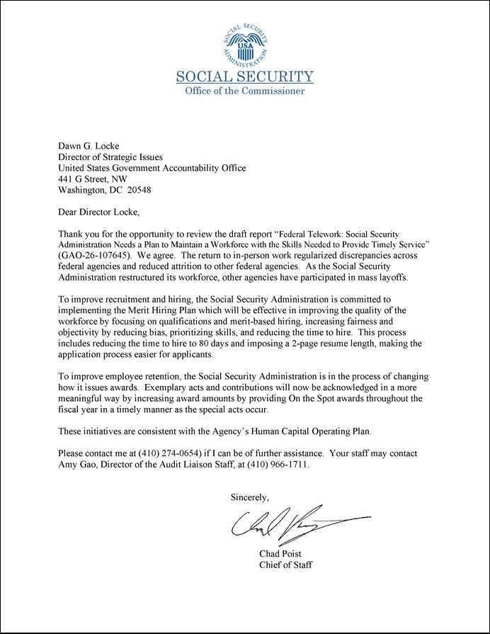 [43]SSA officials said they were implementing White House, Executive Order 14170, Reforming the Federal Hiring Process and Restoring Merit to Government Service, 90 Fed. Reg. 8621 (Jan. 30, 2025). See also Office of Personnel Management, Merit Hiring Plan (Washington, D.C.: May 29, 2025).