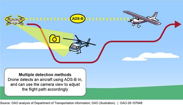 Drones are the fastest growing segment of U.S. aviation, according to the Federal Aviation Administration (FAA). In 2025, FAA forecasted that the commercial drone fleet (those operated in connection with business, research, or educational purposes) would exceed 1 million by the end of 2025 and grow to 1.18 million by 2029. For the same period, FAA forecasted that the recreational fleet (those operated for personal interest and enjoyment) would increase from 1.87 million to 1.93 million. The projected growth in the commercial drone fleet is driven, in part, by interest among companies and other organizations in using drones for advanced and beyond visual line of sight (BVLOS) operations, such as package delivery.[1] Public safety organizations are also interested in increasing drone use for operations such as disaster management, law enforcement surveillance, and hazmat situations. With increasing commercial and public safety drone activity, there are growing concerns among some aviation stakeholders about the potential for collisions between such drones and other aircraft flying in the same airspace.