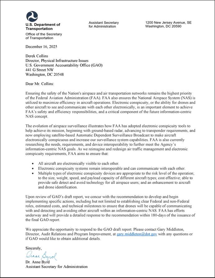 Drones are the fastest-growing segment of U.S. aviation, according to FAA. In 2025, FAA forecasted that the commercial drone fleet would exceed one million by the end of 2025 and grow to 1.18 million by 2029. Operators are starting to use drones for activities including package delivery and public safety. With increasing drone activity, there are growing concerns about potential collisions between drones and other aircraft.