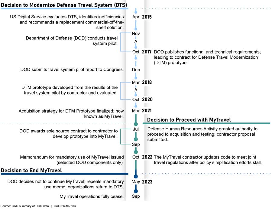 DOD continued the implementation of MyTravel through the first half of 2023. However, in May 2023, the Under Secretary of Defense Personnel and Readiness chose not to exercise the next contract option for the MyTravel product, which ended the MyTravel implementation. This decision, documented in a May 2023 memorandum issued by the Under Secretary of Defense for Personnel and Readiness, repealed the mandatory use memorandum and DOD organizations using MyTravel at the time were directed to revert to DTS. The memorandum also recommended that DOD organizations stop any planned financial systems integrations with MyTravel. Figure 1 highlights key decisions made on the travel system, and related issues.