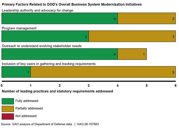 Regarding overall system modernization, DOD has department-wide improvements underway. However, its policies and guidance for managing and directing these efforts do not fully address 11 of 23 leading practices and statutory requirements related to the above four factors. For example, the department has established a framework to monitor progress of selected programs but has not established a permanent leadership structure for the efforts or taken steps to ensure that programs fully align with department-wide goals and priorities. Without fully implementing these leading practices and statutory requirements, DOD can experience coordination issues and inconsistent execution in planning and making improvements to its business systems modernization efforts.