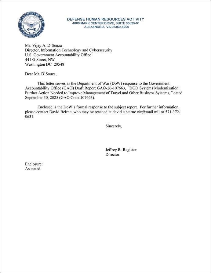 [35]Department of Defense, Under Secretary of Defense, Office for Personnel & Readiness, Letter to House Committee on Oversight and Accountability Subcommittee on Cybersecurity, Information Technology and Government Innovation (Washington, D.C.: July 17, 2022); Hearing on MyTravel contract options, Before the House Committee on Oversight and Accountability Subcommittee on Cybersecurity, Information Technology and Government Innovation, 118th Congress (2023) (statement of Jeffrey R. Register, Director of Defense Human Resources Activity, Department of Defense).