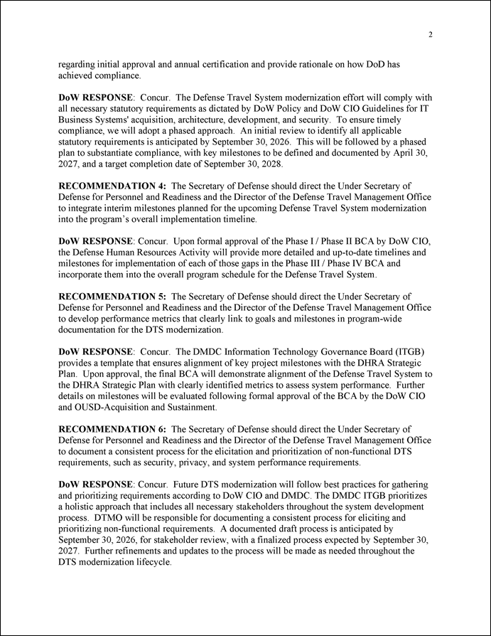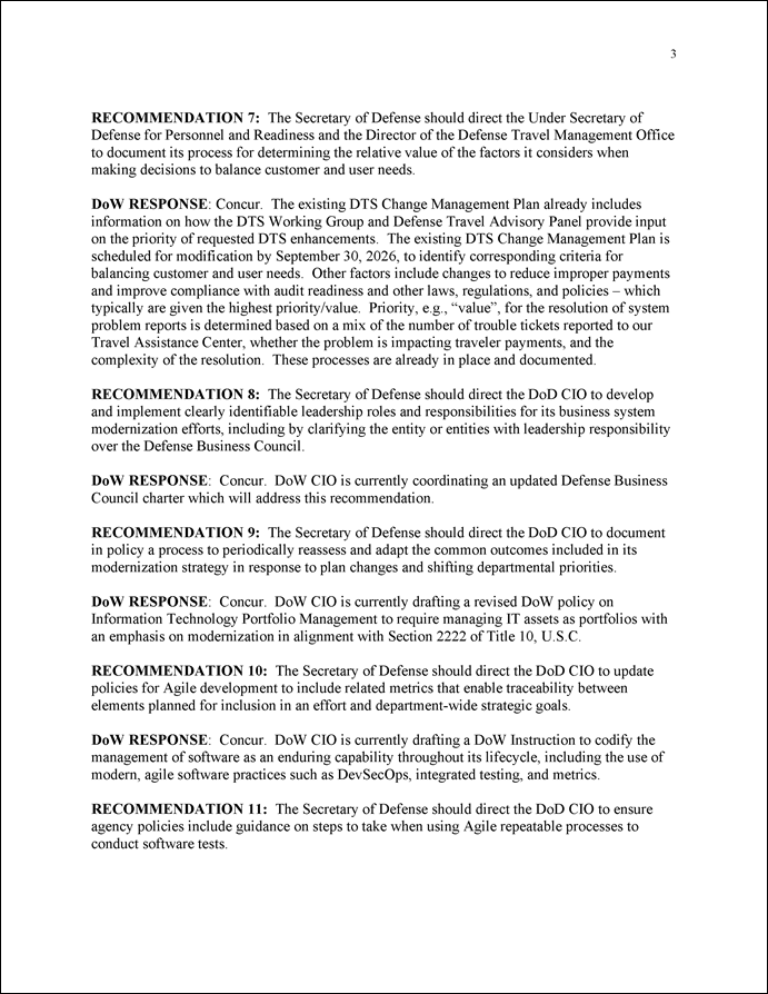 GAO is making 13 recommendations to DOD, including to identify leadership roles for the DTS modernization and department-wide Defense Business Council, and to document details for the tracing and prioritization of requirements. The department concurred with 11 recommendations. Although partially concurring with the remaining two, DOD provided information on steps it had underway or planned to implement all 13 recommendations. GAO will continue to monitor the department’s actions to address these recommendations.