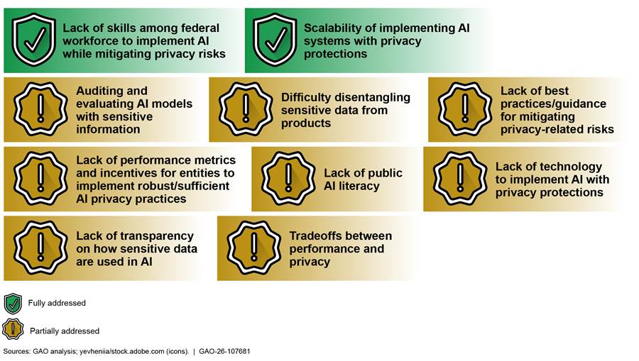 The experts at the roundtable we convened identified 10 key risks, which we defined as the potential negative outcomes or specific threats to privacy that could arise from AI usage if not properly addressed (e.g., data breaches, misuse, bias). An example of a risk is the potential invasion of privacy from data aggregation when using the technology. The experts also identified 13 key challenges, which we defined as the difficulties or obstacles in the process of implementing and managing AI while mitigating privacy-related risks (e.g., regulatory compliance, transparency, data quality). One example of a challenge is that there is currently not a comprehensive privacy law in the United States, leaving gaps and potentially providing inconsistent levels of protection.[46]