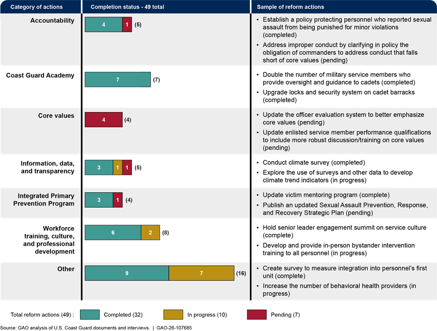 The Coast Guard identified 49 actions to implement as part of its reform effort to address sexual misconduct since July 2023. As of September 2025, the service reported implementing 32 of them. These actions include revising policy to improve accountability for sexual misconduct and developing new training. Coast Guard officials cited several reasons why the 17 remaining actions are incomplete, including their complexity and transitions in the service’s leaders.