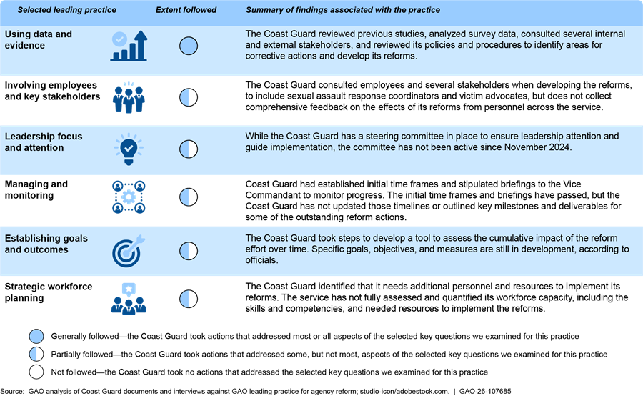 The Coast Guard has taken steps to incorporate aspects of leading practices to support its reform effort to address sexual misconduct, but gaps in key areas may affect its ability to maintain progress and achieve lasting results. For example, consistent with leading reform practices, the Coast Guard obtained input from its employees and stakeholders and reviewed prior studies and data on sexual misconduct in the service to identify areas for corrective actions. However, the lack of a defined channel for Coast Guard personnel to share feedback on the effects of the reforms may limit transparency and hinder personnel engagement with reform efforts. Further, while the Coast Guard established an executive steering committee to guide its sexual misconduct reform efforts, the committee has not met since November 2024, and there are no milestones or updated time frames for some of its remaining actions. This may limit the committee’s ability to maintain continued focus and ensure steady progress. Moreover, the Coast Guard has not developed an evaluation plan to assess the effectiveness of its efforts, and our prior work has shown the service faces continued challenges in determining its workforce needs.