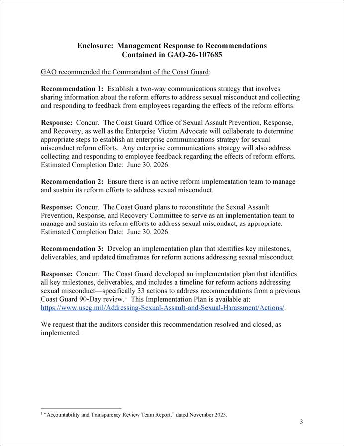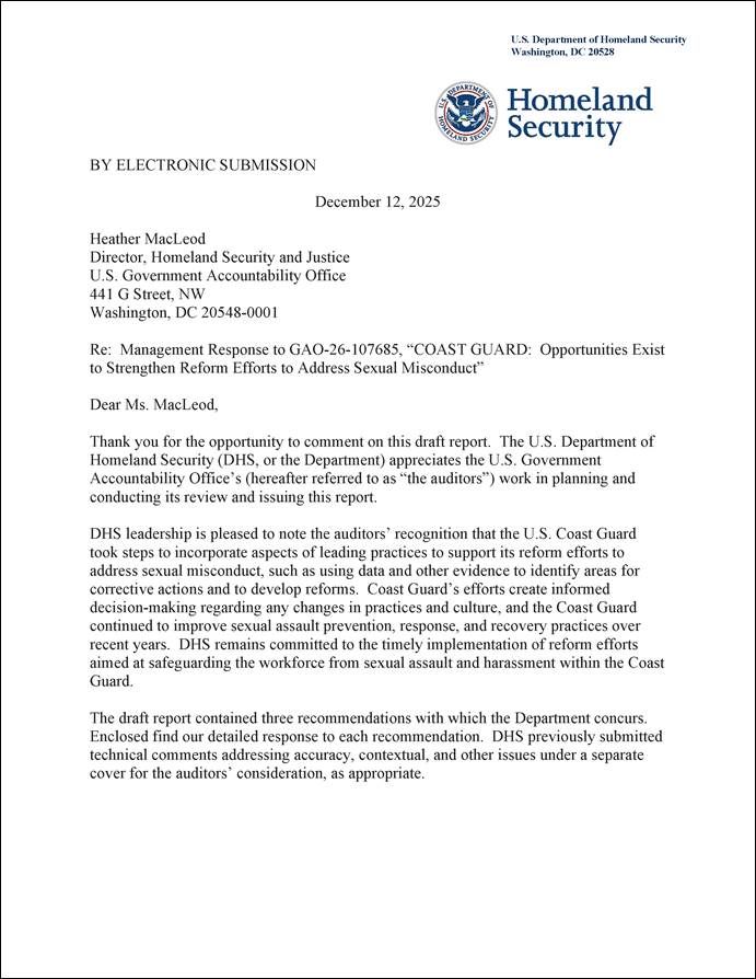 [3]After we provided our draft to DHS for comment, the National Defense Authorization Act for Fiscal Year 2026 was enacted. The law adds new requirements for the Coast Guard related to covered misconduct, which the law defines to include sexual assault and sexual harassment, such as issuing new policies and procedures. The law also includes a provision for GAO to review the Coast Guard’s efforts to implement these requirements and the effectiveness of Coast Guard efforts to mitigate sexual assault and sexual harassment, among other things See Pub. L. No. 119-60, div. G, tit. LXXV, subtit. A, sec. 7501(a)(2)(A)(i), subtit. B, sec. 7511(a), § 2533, 2539, 139 Stat. 718 (2025).
