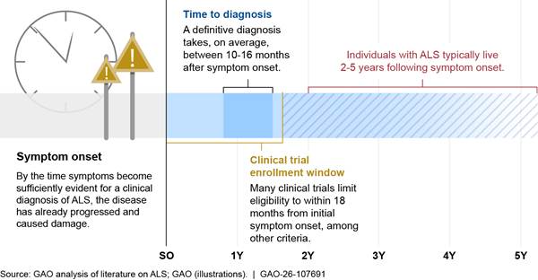 [16]By the time symptoms are sufficiently evident for a clinical diagnosis of ALS, the disease has progressed and the clinical trial enrollment window may have passed. One review of 38 ALS clinical trials found that, on average, 60 percent of individuals with ALS are ineligible to participate in clinical trials on the day they are diagnosed. However, the authors estimated that in a real-world setting it is likely that closer to 80 to 96 percent of individuals with ALS are ineligible for clinical trials, as most individuals do not enroll in clinical trials the day they are diagnosed. Ruben P.A. van Eijk, et al., Refining Eligibility Criteria for Amyotrophic Lateral Sclerosis Clinical Trials, Neurology, Vol. 92, no 5 (2019). The National Academies also reported that delays in diagnoses among Black individuals with ALS can be more than 50 percent longer than among White individuals with ALS. National Academies, Living with ALS, 2024. This may contribute to lower participation in clinical trials among Blacks and other underrepresented populations. For example, one article from 2022—published in collaboration with the Department of Veterans Affairs—noted that while the Centers for Disease Control National ALS Registry indicates that 83 percent of individuals with ALS in the United States are White, data from clinical trials shows that 95 percent of ALS clinical trial participants are White. Christina N. Fournier, “Considerations for Amyotrophic Lateral Sclerosis (ALS) Clinical Trial Design,” Neurotherapeutics, vol. 19, no. 4 (2022).