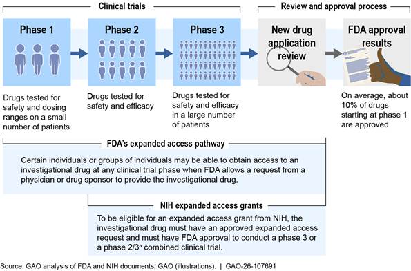[1]For the purposes of this report, an investigational drug is a drug or biologic used in a clinical trial that is not yet approved or licensed by FDA for marketing or is being tested in a clinical trial for an unapproved use or new patient population. Biologics are generally derived from living material, such as the human body or a microorganism, and are generally more complex than chemically synthesized drugs.