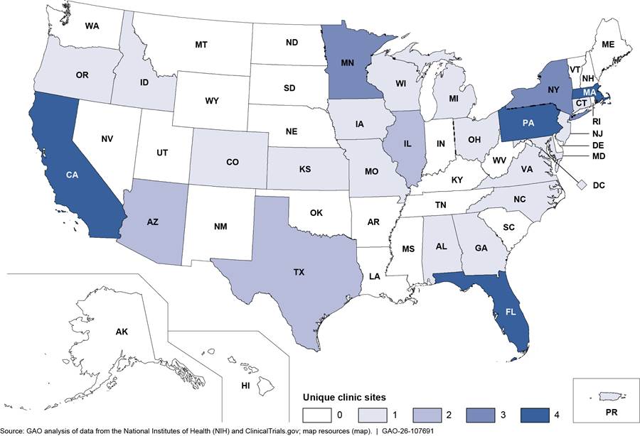 Some expanded access programs not funded by the grants also added clinic sites after the ACT for ALS Act was enacted, including in states that did not previously have any clinic sites before the act was enacted. See appendix III for a table of expanded access grant and expanded access program clinic sites, by state.