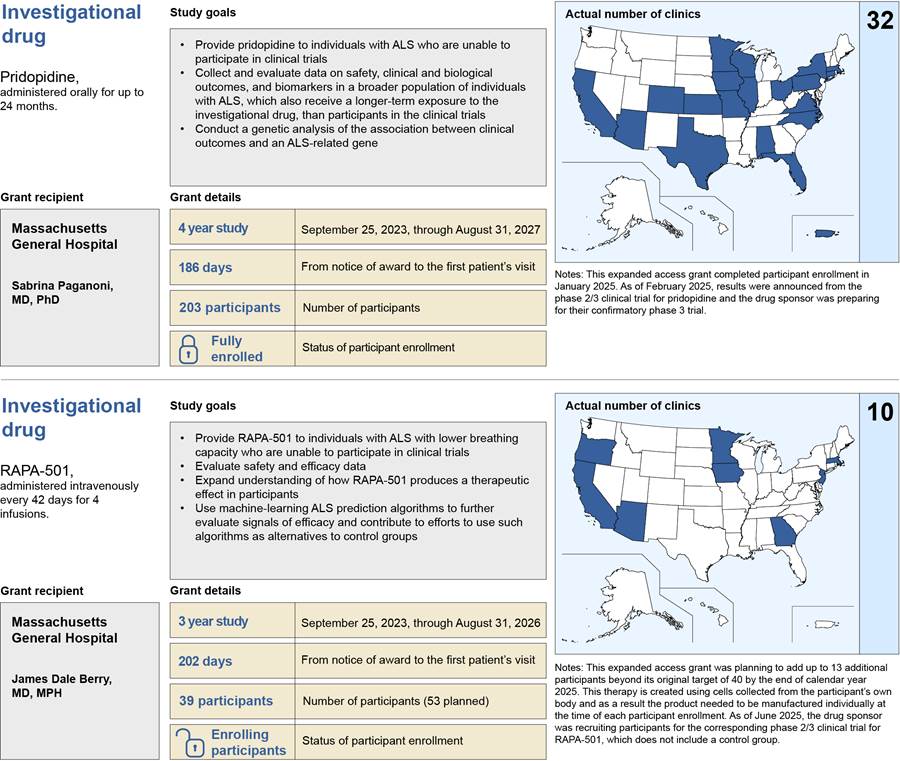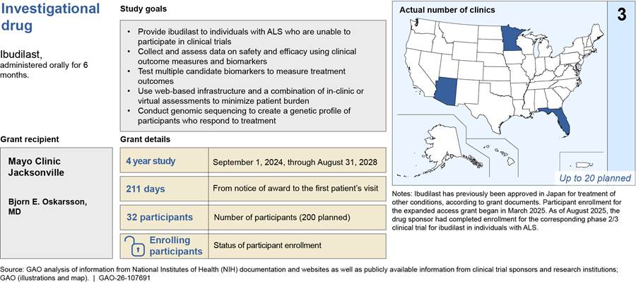 [26]The five expanded access grant recipients had between three and 32 clinic sites as of August 2025, with several of these clinic sites providing investigational drugs for more than one expanded access grant. We counted the one virtual option as one clinic site. The expanded access grant recipient for ibudilast—the most recently awarded grant—began enrolling participants in March 2025, according to NIH. As of August 2025, it had three clinic sites, and expected to have five additional clinic sites prepared to enroll participants by September 2025 and up to 20 clinic sites by the end of its second year.