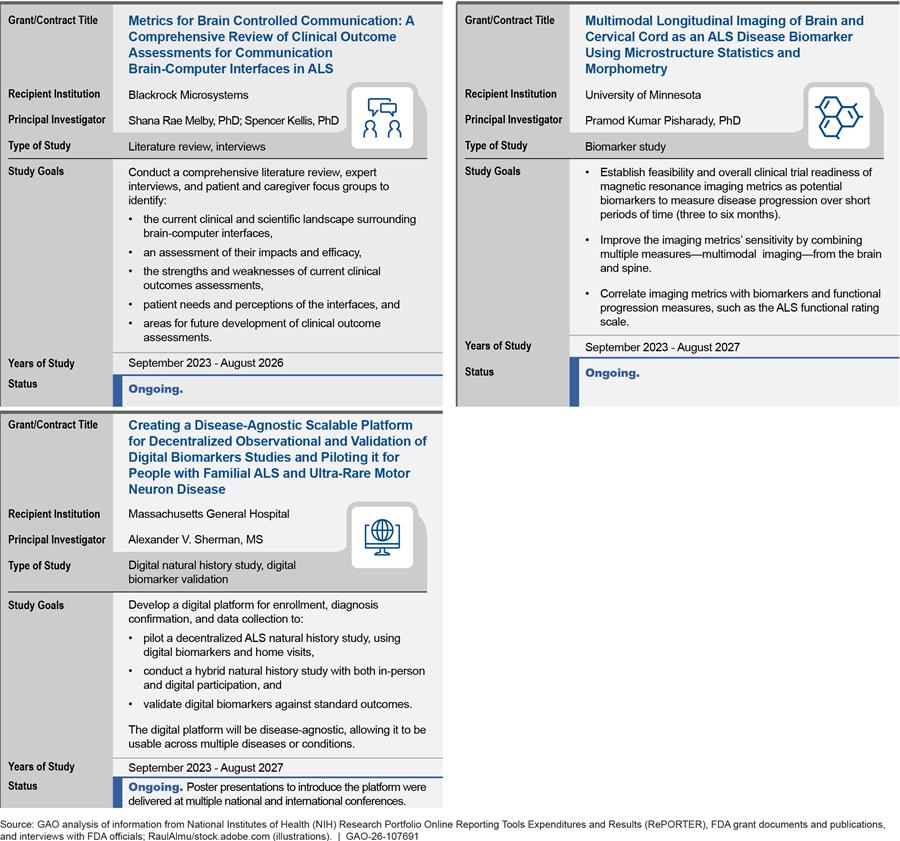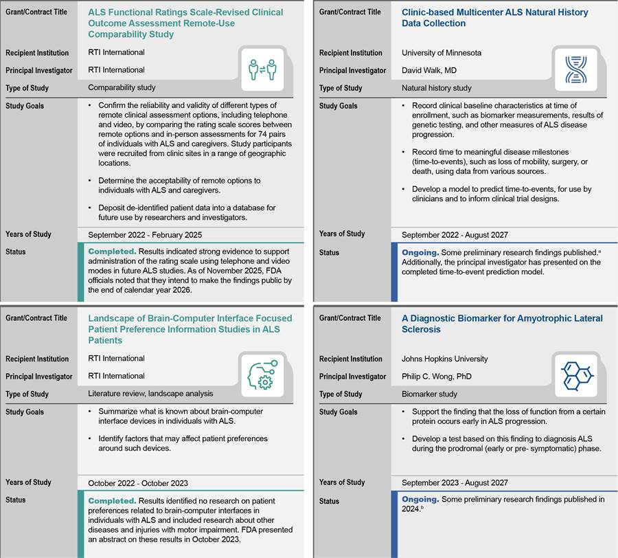 To describe the funding NIH and FDA awarded, as well as the anticipated effect of the funding, we also reviewed grant summaries and data from two databases as of November 2025. First, NIH Research Portfolio Online Reporting Tools Expenditures and Results (NIH RePORTER) contains information about research projects funded by NIH and FDA, including funding amounts, length of the funding period, the funding recipient, and research goals. Second, ClinicalTrials.gov, also operated by NIH, contains additional information about expanded access programs, including those funded by the ALS expanded access grants, such as a description of the investigational drug and a list of participating clinic sites.[8] To assess the reliability of both databases we reviewed related documentation, interviewed agency officials knowledgeable about the databases, and compared the information in the databases to other publicly available information. On the basis of these steps, we found these data sufficiently reliable for the purposes of our reporting objectives.