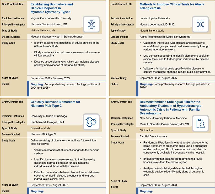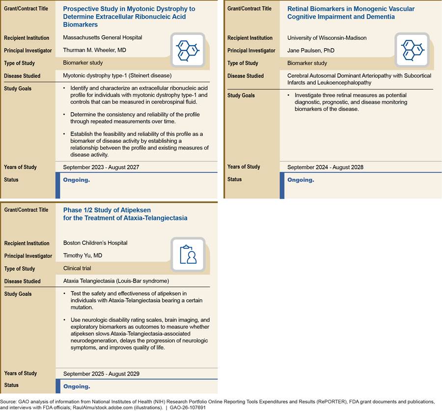 [61]FDA awarded one grant for fiscal year 2025 on September 22, 2025. Due to the timing of the grant award, we did not include this twelfth grant in our analysis of the current and potential benefits of FDA funding awarded through the Rare Neurodegenerative Disease Grant Program. However, a summary of the research goals of the grant is included in appendix II.