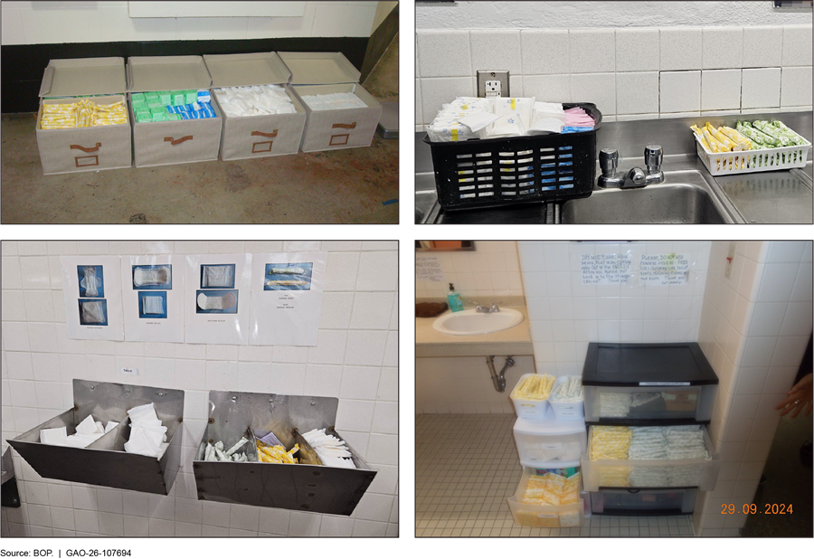 During our site visits, we observed how five BOP institutions made menstrual products available to incarcerated and detained individuals. For example, at one institution, staff provided menstrual products in containers in the common area in the housing unit. At three institutions, staff provided products in containers in the bathrooms. Staff at these four institutions also maintained a storage cabinet with a backup supply of menstrual products and can access additional products from a warehouse located at the institution. At the fifth institution we visited, however, we observed an empty storage container for menstrual products inside the housing unit’s common area, which we discuss in more detail later in this report. See figure 2 for examples of how some BOP institutions we visited provided menstrual products.