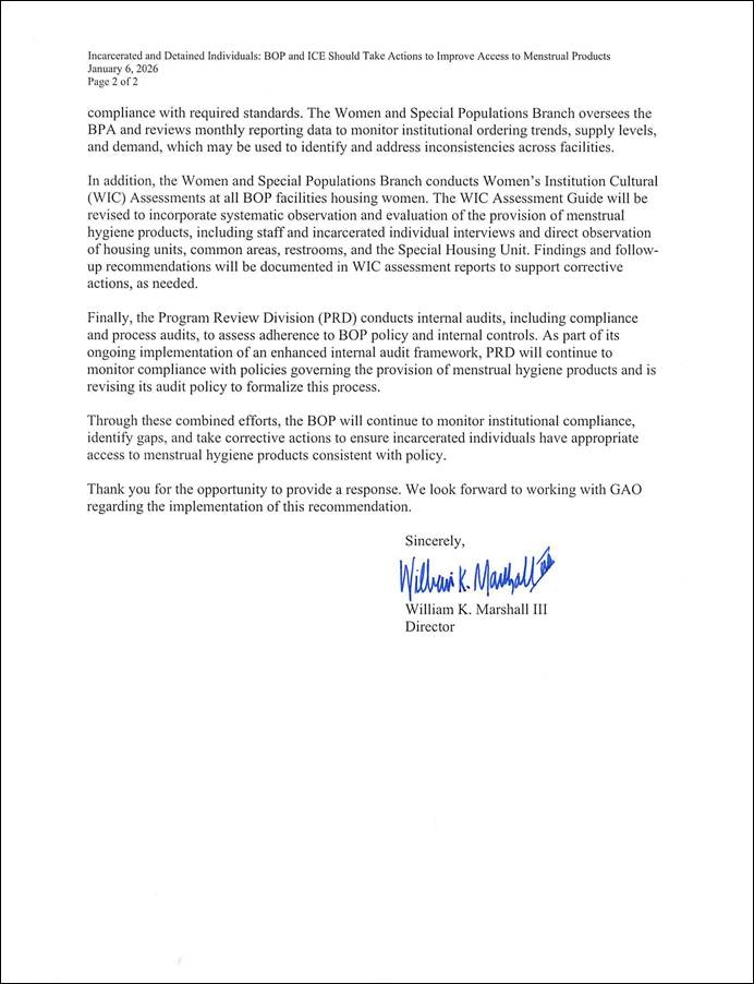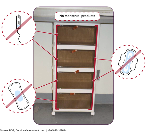 Menstrual Products: Product Quality in Bureau of Prisons (BOP) Institutions The First Step Act requires that the Director of BOP ensures that the menstrual products provided at its institutions conform with applicable industry standards for quality. According to BOP officials we interviewed, the Food and Drug Administration considers menstrual products to be medical devices but does not set minimum standards for product quality. Officials said they are not aware of any industry standards that govern the quality of menstrual products. The quality of products may influence whether these products are acceptable to incarcerated and detained individuals. According to officials, staff at individual institutions are responsible for purchasing menstrual products, and they should be assessing the quality of those products. Surveyed officials from 14 of the 29 institutions reported that they assess the quality of the menstrual products they provide for free. Officials at nine of these institutions reported that they seek feedback from the incarcerated and detained individuals about the quality of these menstrual products. Of the 41 incarcerated and detained individuals we spoke with who used the free menstrual products at their institutions, 20 said they were unsatisfied with either the quality or selection of the products. For example, individuals said that the pads were either too thin or too thick, were not sufficiently absorbent, or did not stick well enough to undergarments. Individuals said that the tampons were cheap, not absorbent enough, or the cardboard applicator was uncomfortable. Two dozen incarcerated and detained individuals we spoke with said they knew of someone or had themselves experienced soiled clothing or bedding while using free menstrual products. According to BOP officials, individuals may soil clothing or bedding for several reasons, including product quality or incorrect use. Officials said that individuals may purchase menstrual products from the commissary if they are unsatisfied with the free products. Twelve individuals we spoke with said they had purchased menstrual products from the commissary, and five of them said the commissary products are better quality than products provided for free. Source: GAO analysis of questionnaire responses from 29 BOP institutions that housed women in fiscal year 2024, interviews with BOP officials, and interviews with incarcerated individuals. I GAO‑26‑107694 |