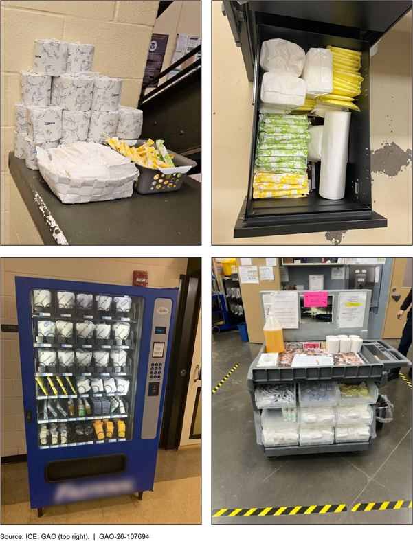 To determine the extent to which ICE provides access to menstrual products for detained individuals, we conducted site visits to a nongeneralizable sample of three ICE facilities. On the visits to these facilities, we observed what types of menstrual products—pads, tampons, panty liners—are provided, how they are provided, and when. We selected facilities to ensure variation in the number of women housed and facility type, among other criteria.[9] The evidence gathered from these site visits is not generalizable but provides examples of the types of menstrual products provided, as well as how and when ICE officials provide access to menstrual products.