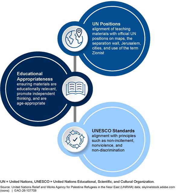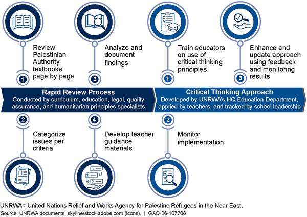 [25]UNRWA’s approach to addressing problematic content has changed over the years. In 2019, we reported that UNRWA developed specific complementary teaching materials for any page with issues identified, such as alternate photos, examples, and guidance for teachers, as needed, to use with the textbooks in UNRWA schools. GAO-19-488. UNRWA subsequently implemented the Teacher Centered Approach, which faced challenges with teacher and community acceptance, according to UNRWA. UNRWA officials also told us that they then started using the Critical Thinking Approach, because teachers reacted negatively to the implication that they were at the center of the Teacher Centered Approach, rather than the students, who were the priority. While the name of UNRWA’s approach to address problematic content has changed, the primary functions of the approach have remained consistent.