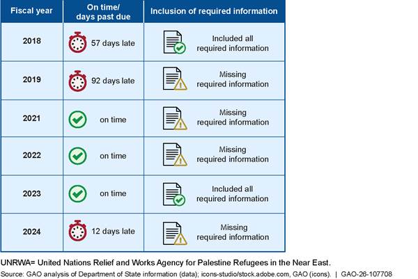 · State submitted its 2024 report after the statutory deadline and omitted required information on UNRWA’s procedures to substitute problematic material with curricula that emphasizes the importance of human rights, tolerance, and nondiscrimination. The report also omitted required information on the steps taken by UNRWA to respond to claims that are determined not to be credible. State officials told us that the 2024 report was delayed because of its efforts to fact check and clear the report internally to ensure accuracy in its submission.